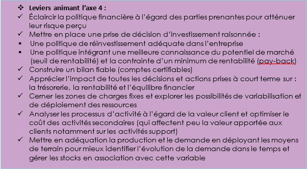 Deux dimensions ont été identifiées, une première qui vise à renforcer la capacité de résilience à court terme que nous intitulons « la dimension de la survie » et une seconde qui a pour finalité d’instaurer les fondamentaux d’une nouvelle dynamique à moyen et à long termes que nous appelons la dimension de la régénérescence. Nous avons proposé des leviers sur quatre axes pour renforcer ces deux dimensions.